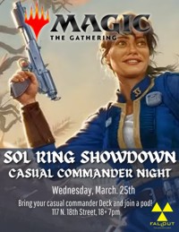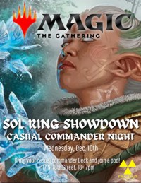 | Wednesday, December 10th Sol Ring Showdown A great opportunity to meet other players! Whether you are new to Magic, or a long time player this is the place for you. (Tier 3 or below decks suggested)