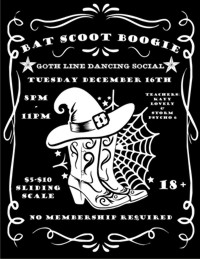 | Tuesday, December 16th Bat Scoot Boogie Grab your boots and a hat and pop on down to the Saloon for Bat Scoot Boogie, a Goth Line Dancing Social!