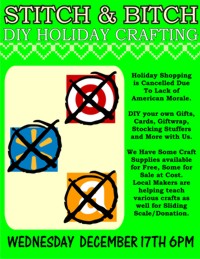 | Wednesday, December 17th Stitch & Bitch: Holiday DIY Crafting We are gonna watch classic holiday films and do major crafting for the Holidays!