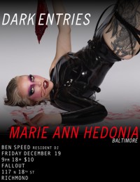 | Friday, December 19th Dark Entries ft. Anne Marie Hedonia DJ Ben Speed Spinning Vinyl Goth/Wave/Synth/New Beat/EBM With Special Guest Performance by Anne Marie Hedonia