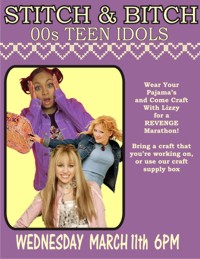 | Wednesday, March 11th Stitch & Bitch: 00s Teen Idols Wear Your PJs, Bring a crafty project and hang out with Lizzy! We have some free craft supplies as well!