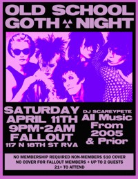 | Saturday, April 11th Old School Goth All Old School Music All Night! All Music played will be from prior to 2005