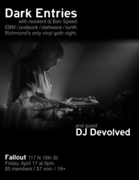 | Friday, April 17th Dark Entries with Guest DJ Devolved DJ Ben Speed Spinning Vinyl Goth/Wave/Synth/New Beat/EBM With Special Guest DJ Devolved